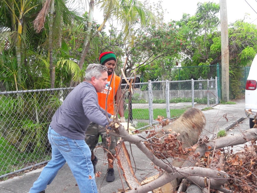 The group provided free cleanup, repairs, and help for residents in need. In this photo from WLRN, volunteers with Konscious Kontractors remove tree branches from a Little Havana home.